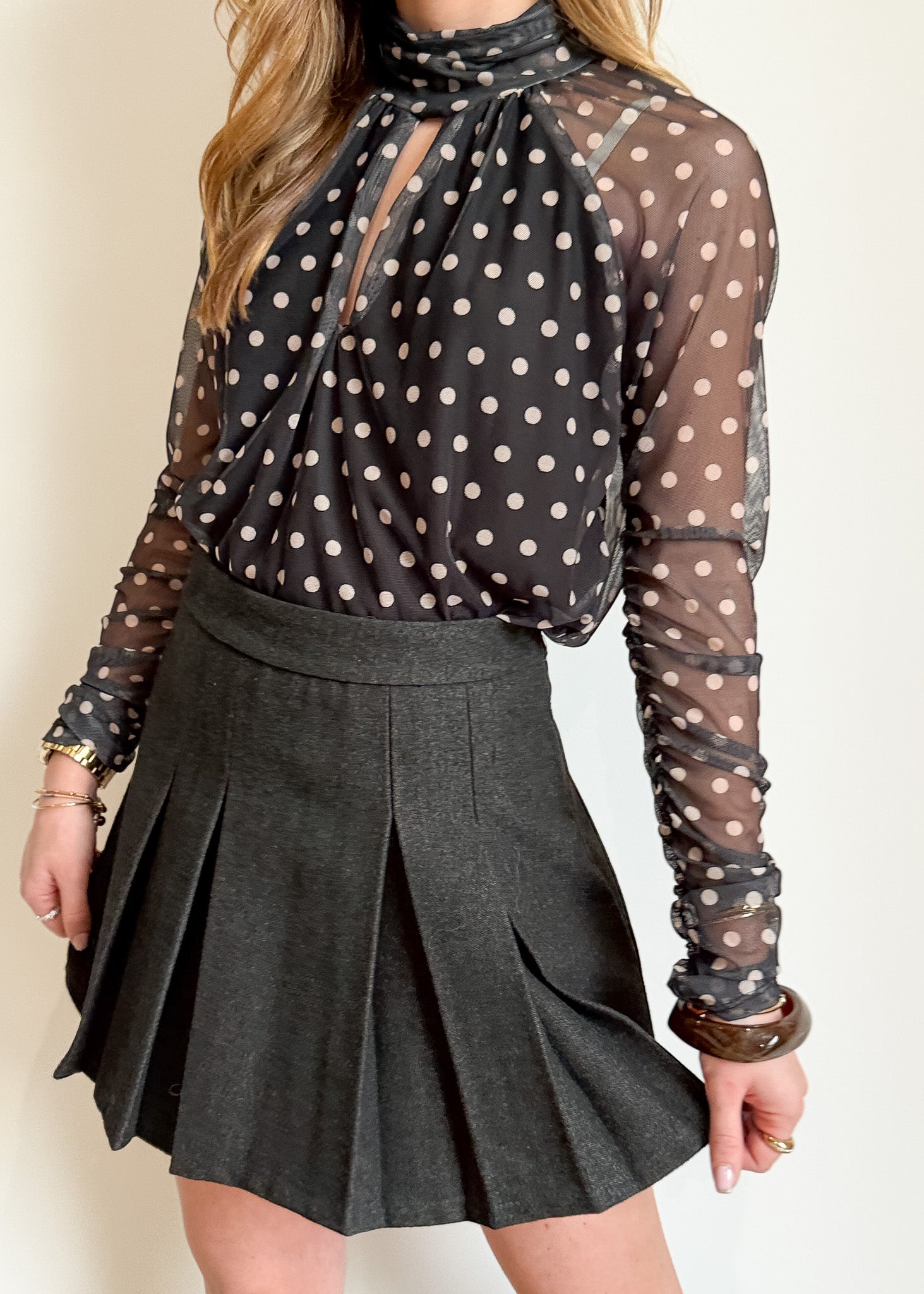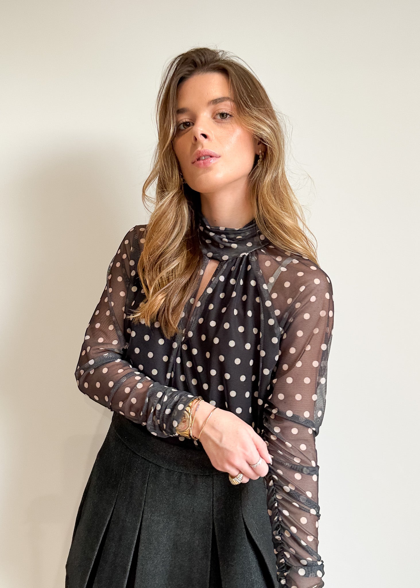 Élégant et délicat, ce body à pois apporte une touche sophistiquée à toutes vos tenues. Sa matière légère et légèrement transparente crée un jeu de textures subtil, parfait pour un look chic sans effort.