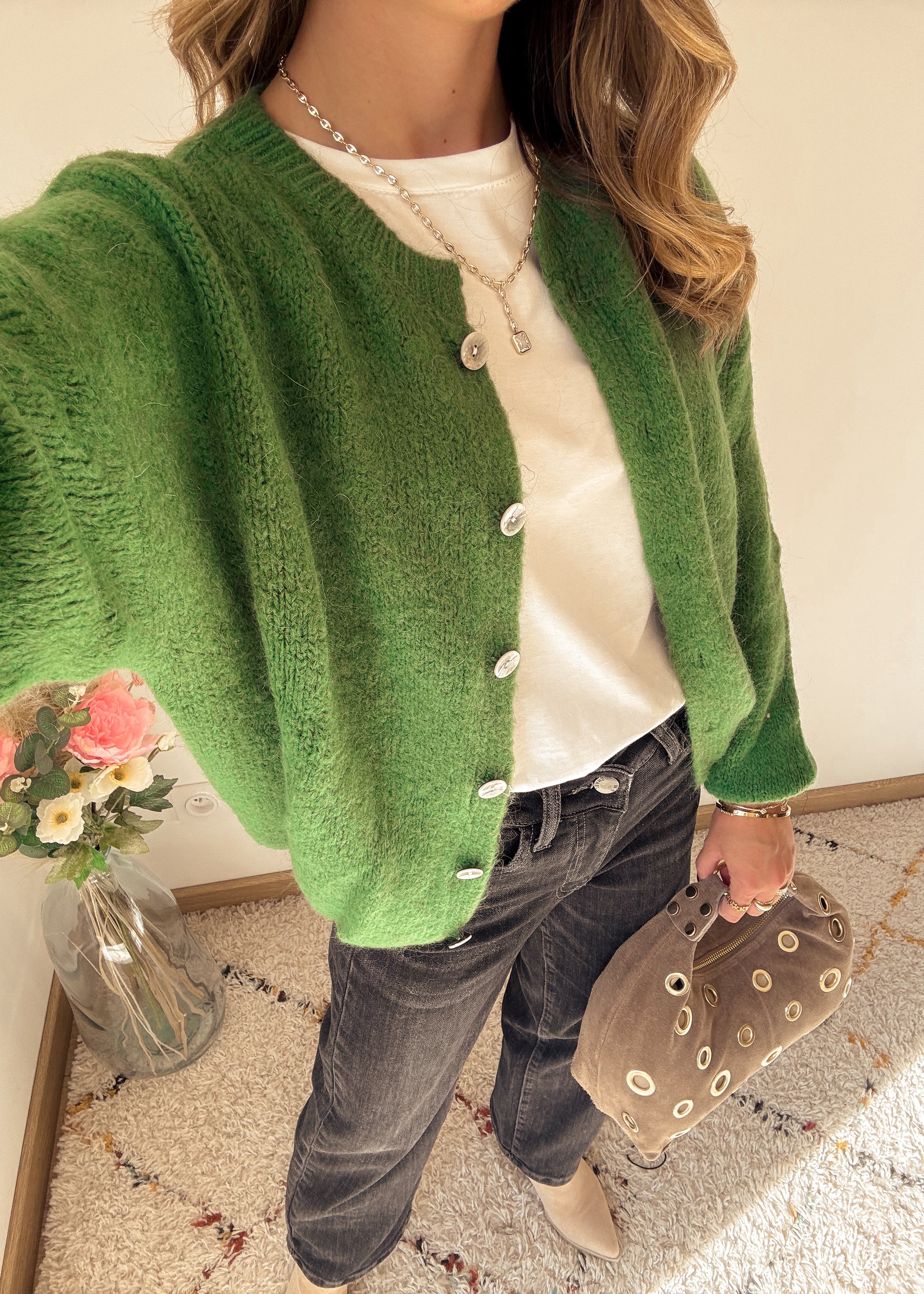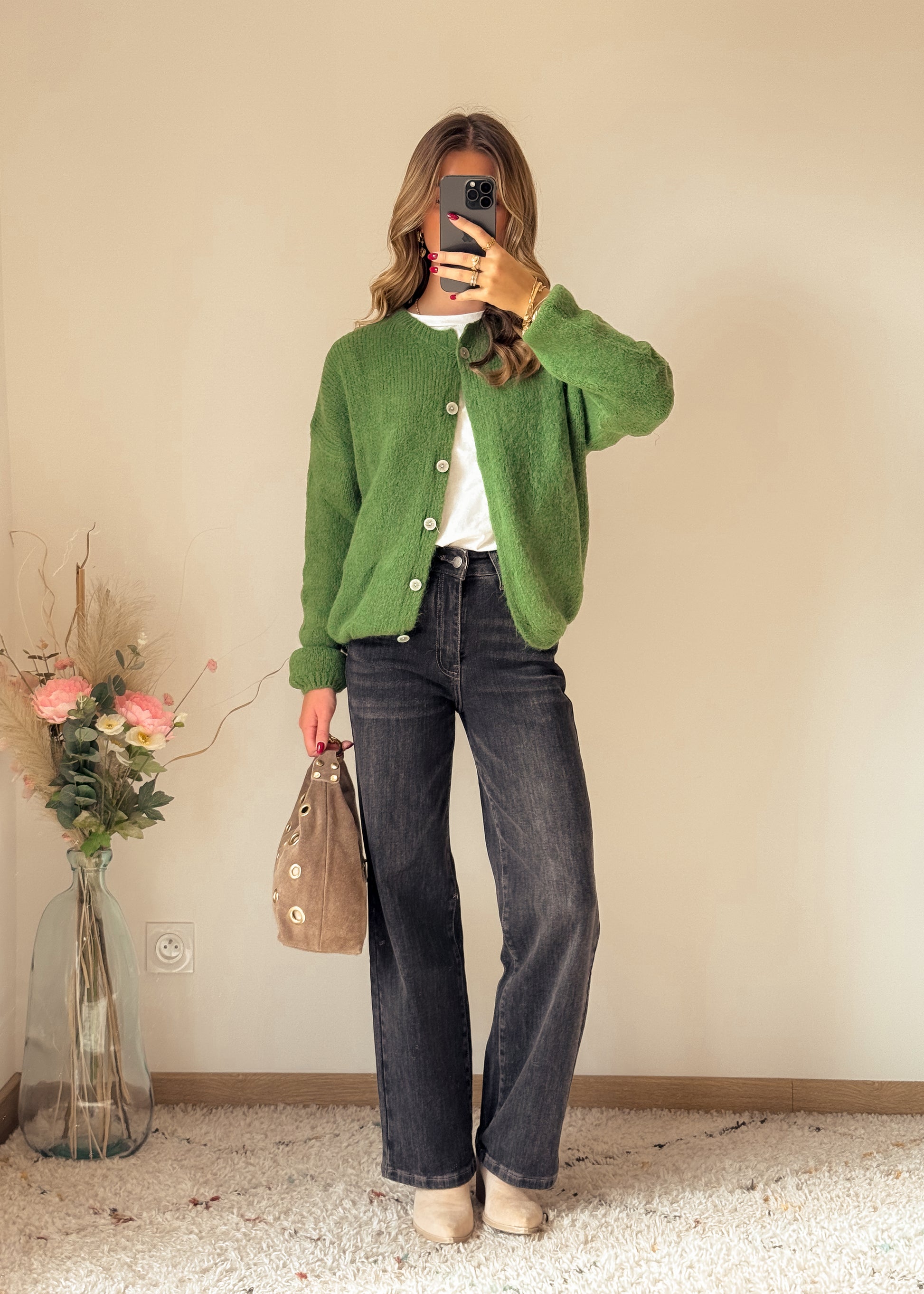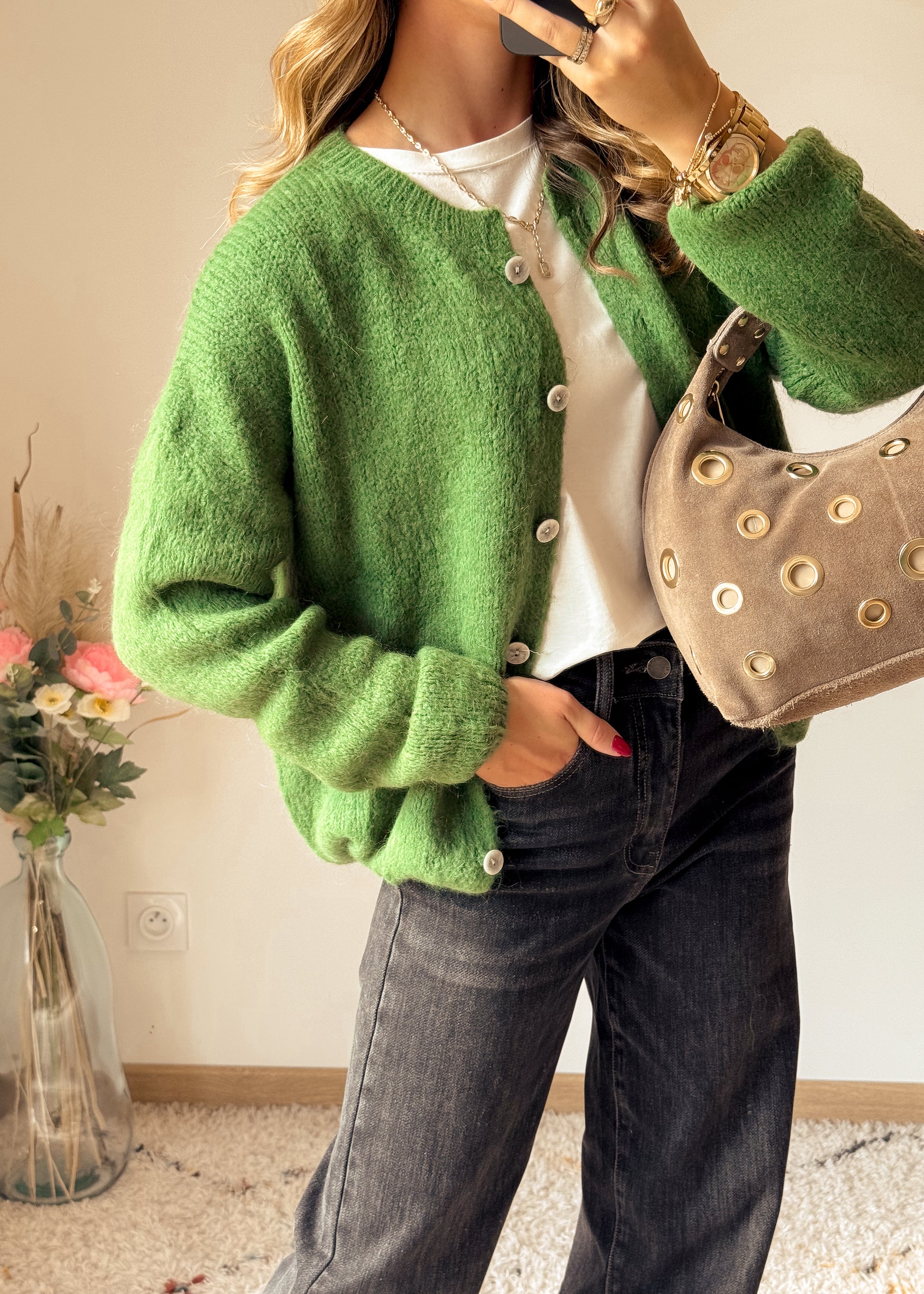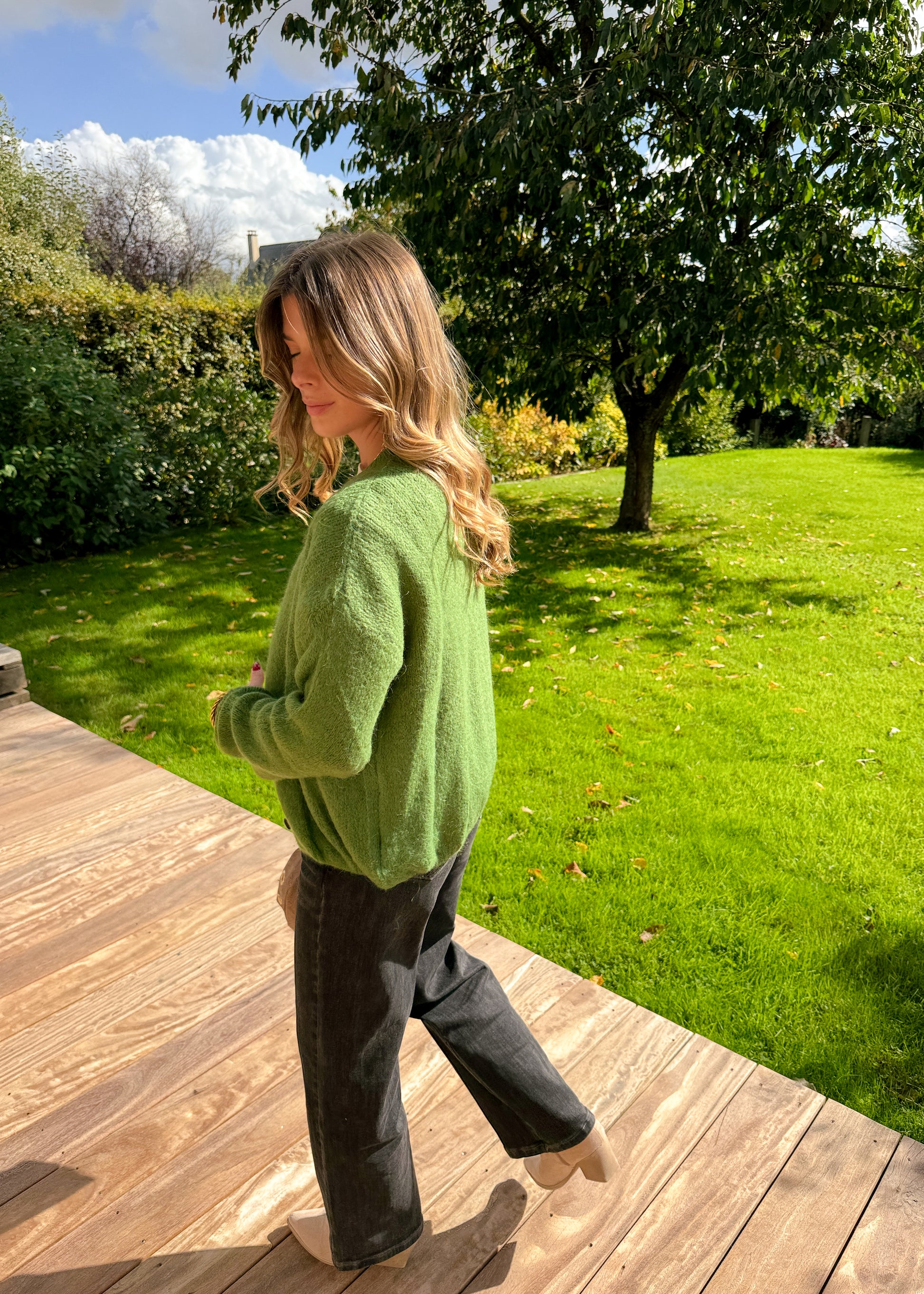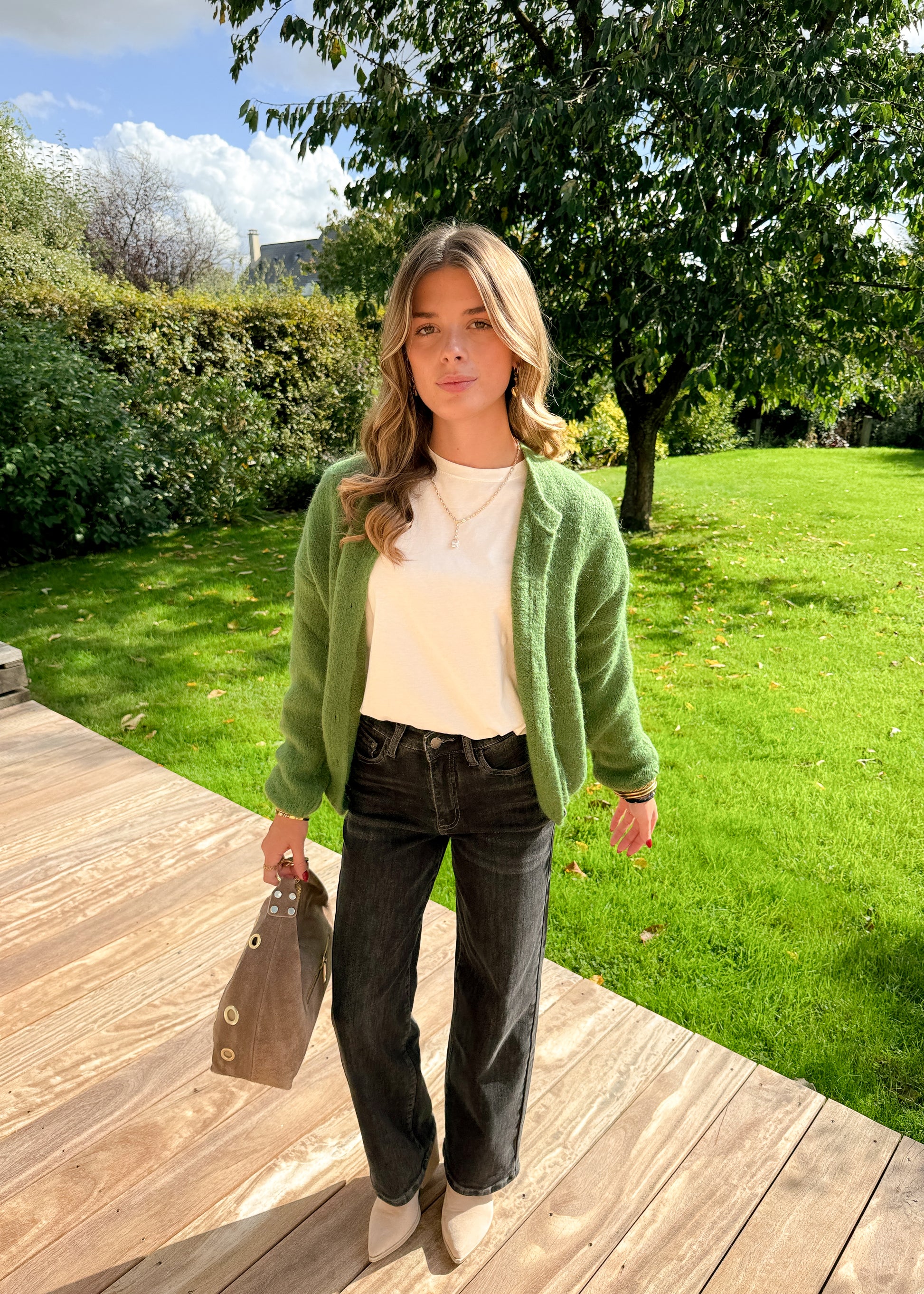 Découvrez le gilet Candy. Sa teinte vert olive et sa texture ultra-douce en font une pièce à la fois tendance et confortable.