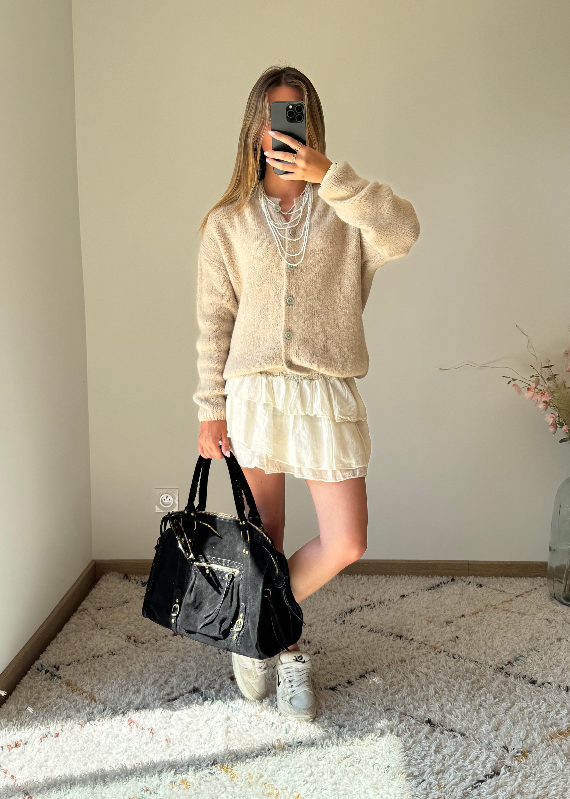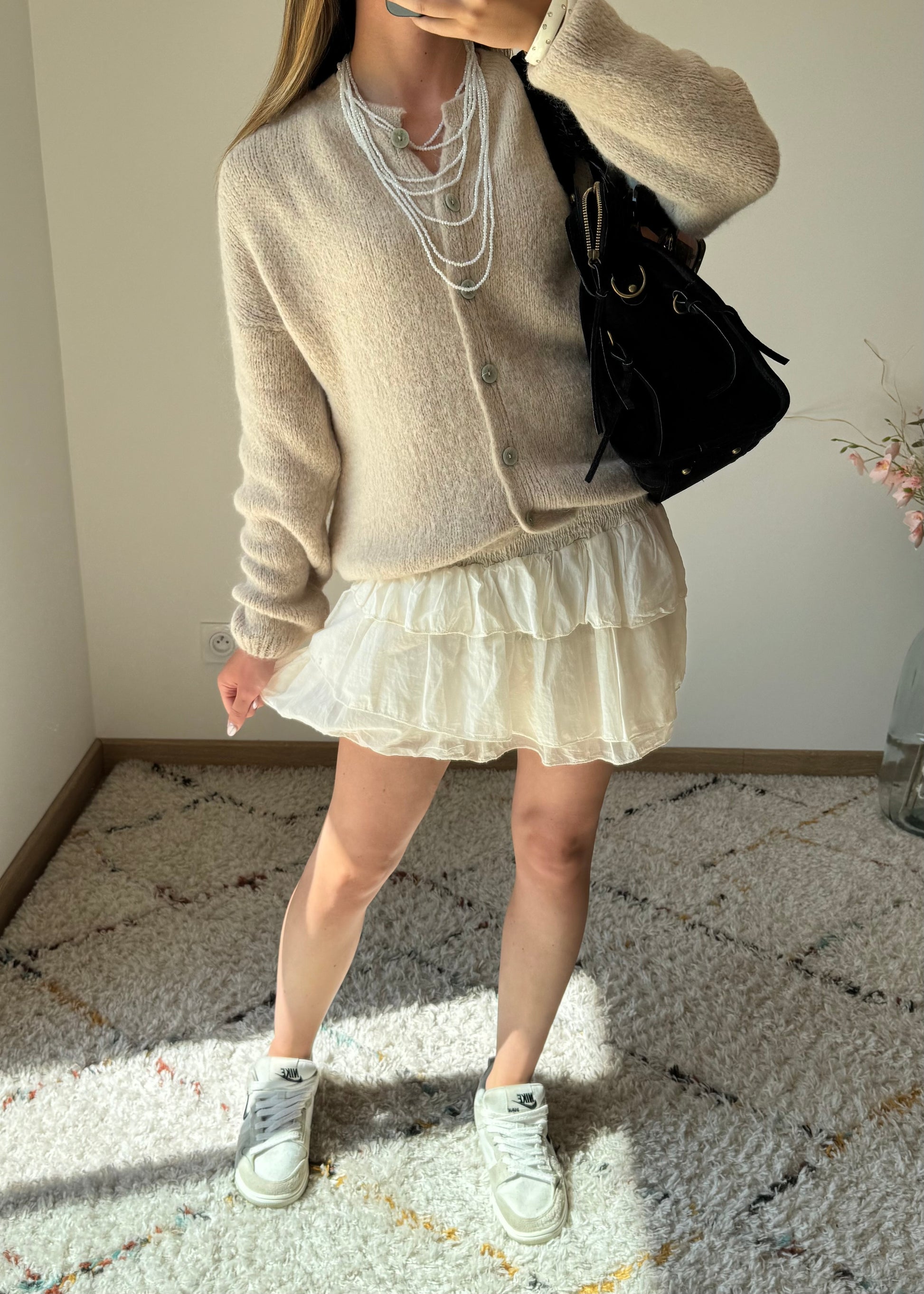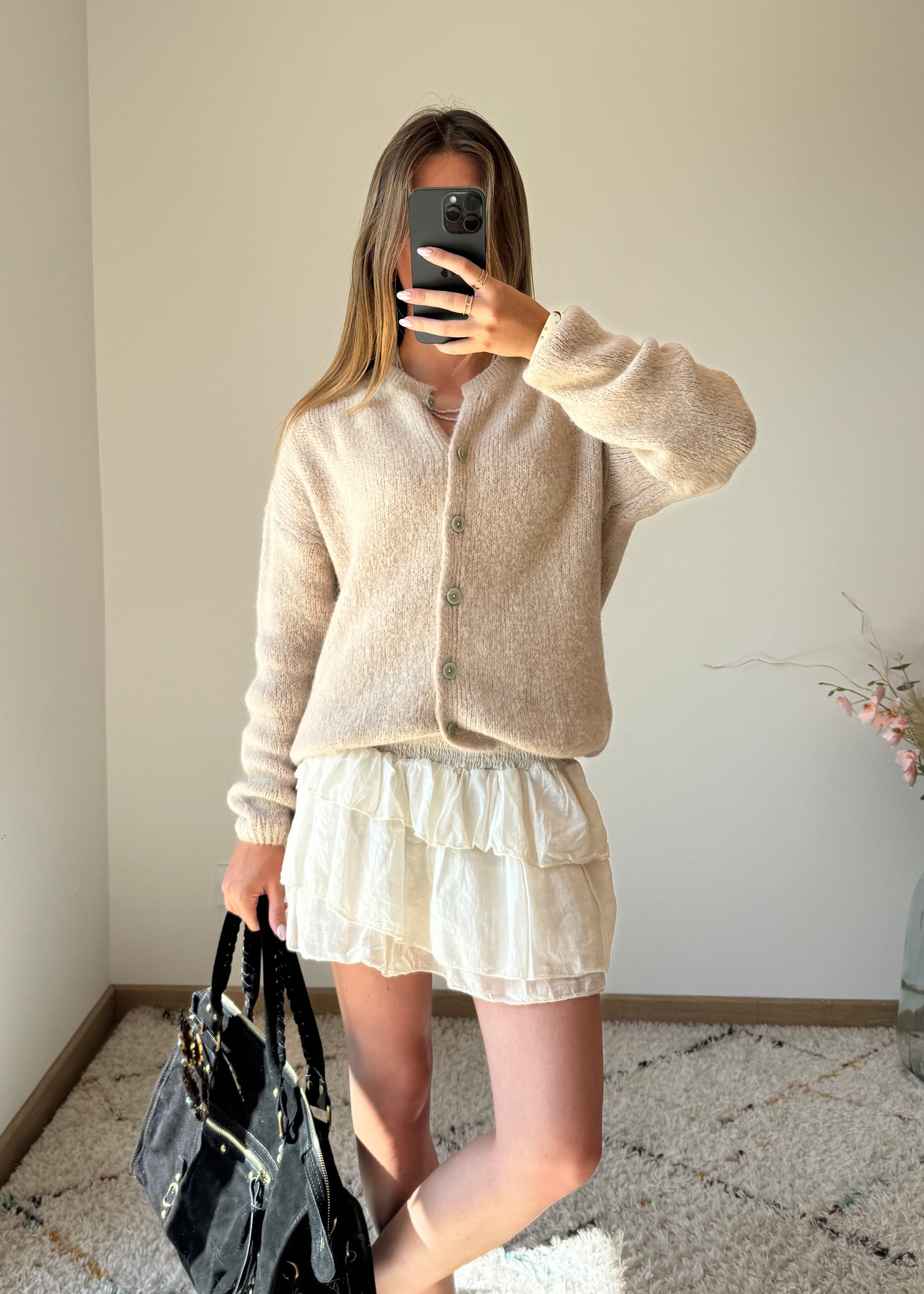 Découvrez le gilet Candy. Sa teinte beige et sa texture ultra-douce en font une pièce à la fois tendance et confortable.