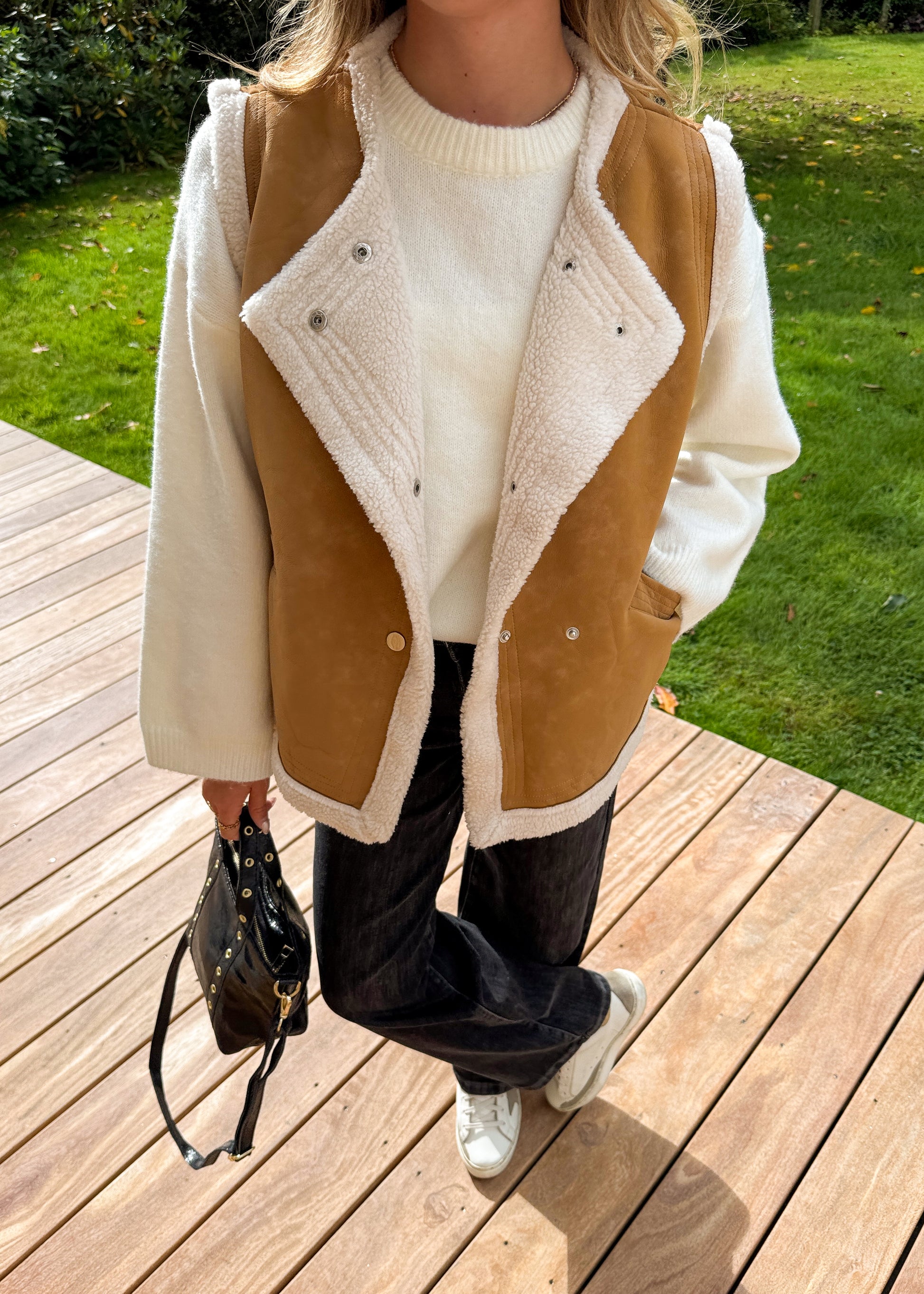 Découvrea la veste Canelle et apportez une touche chaleureuse et tendance à vos looks avec cette veste sans manches camel.