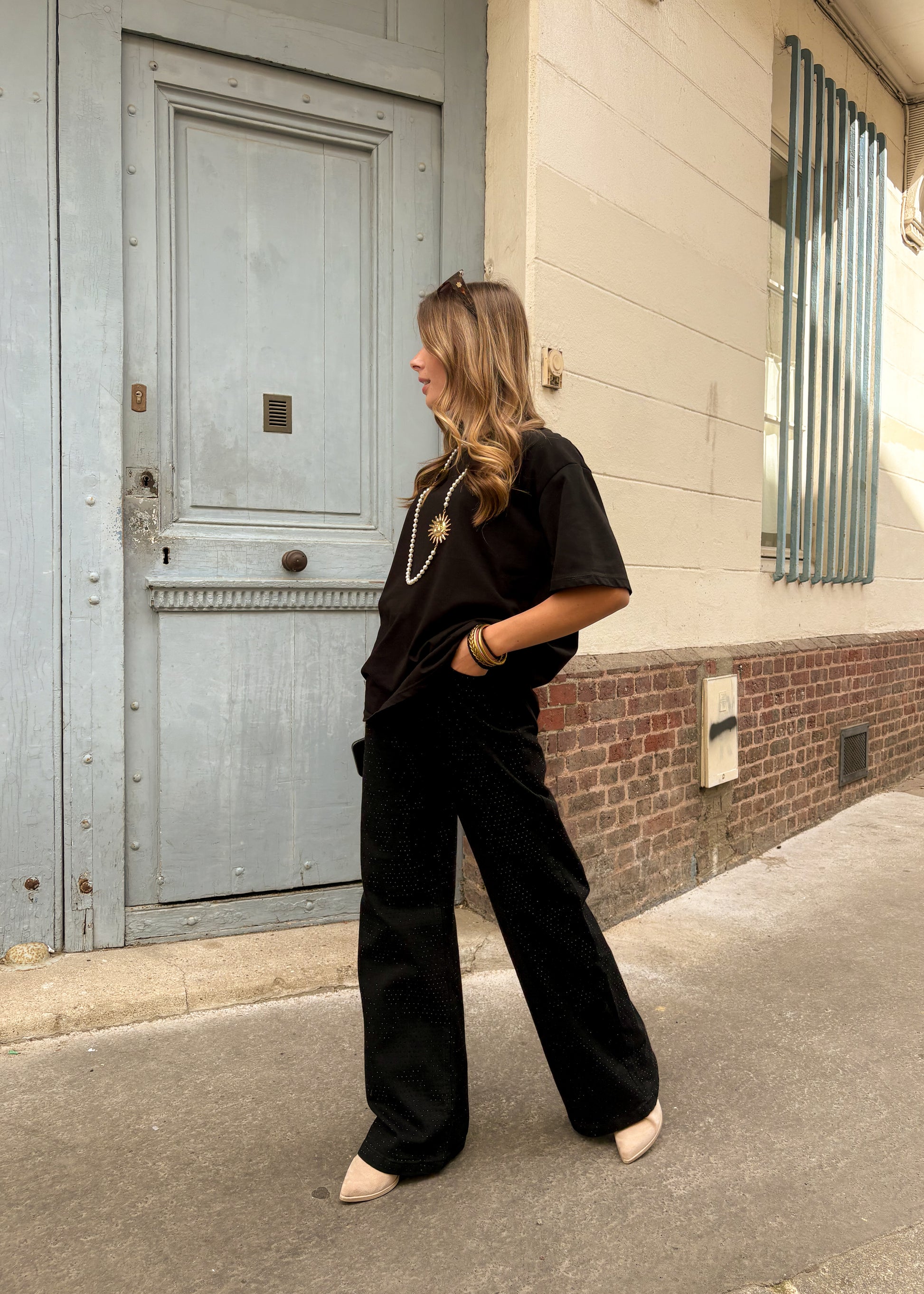Découvrez le jean Diva noir parsemé de micro-strass ton sur ton. Sa coupe droite et moderne offre une silhouette flatteuse tout en restant confortable et facile à porter.