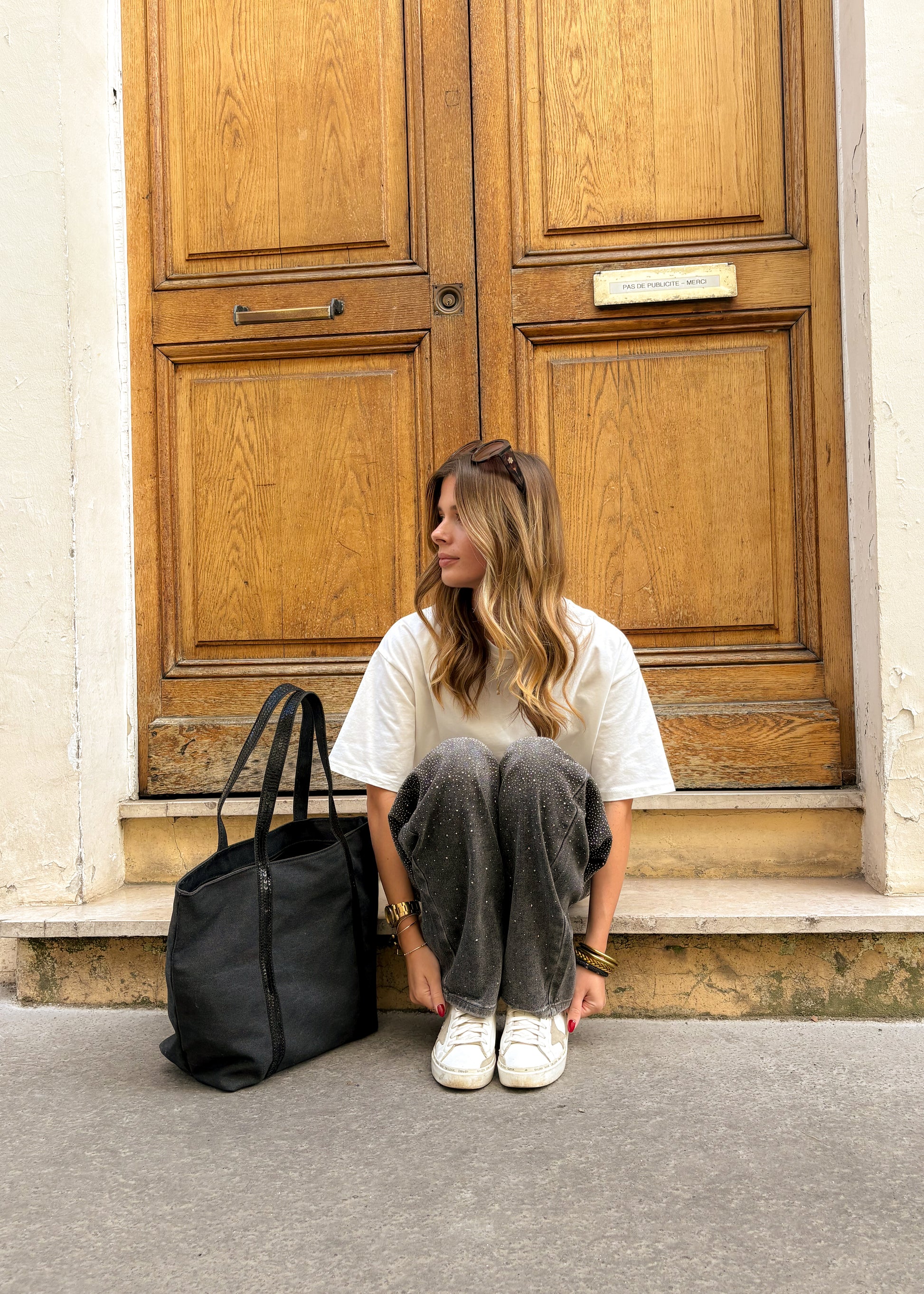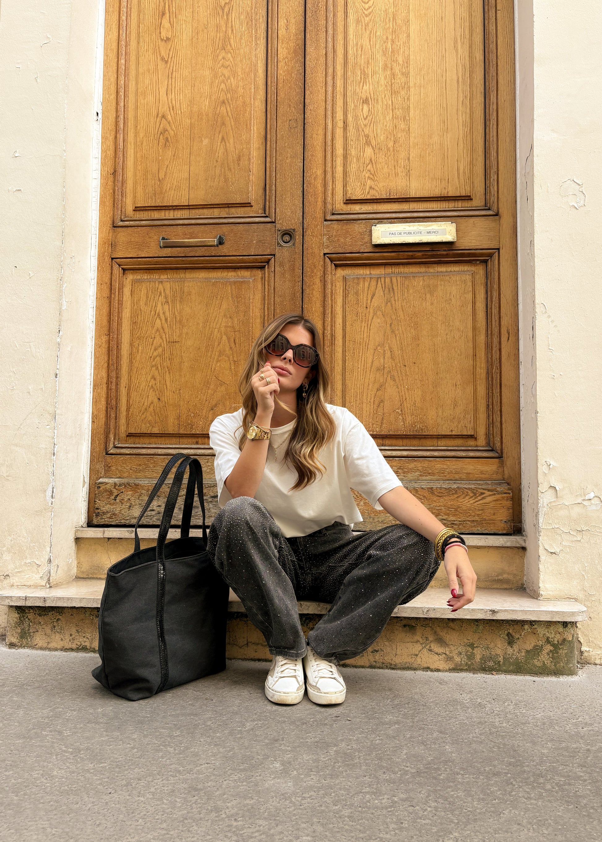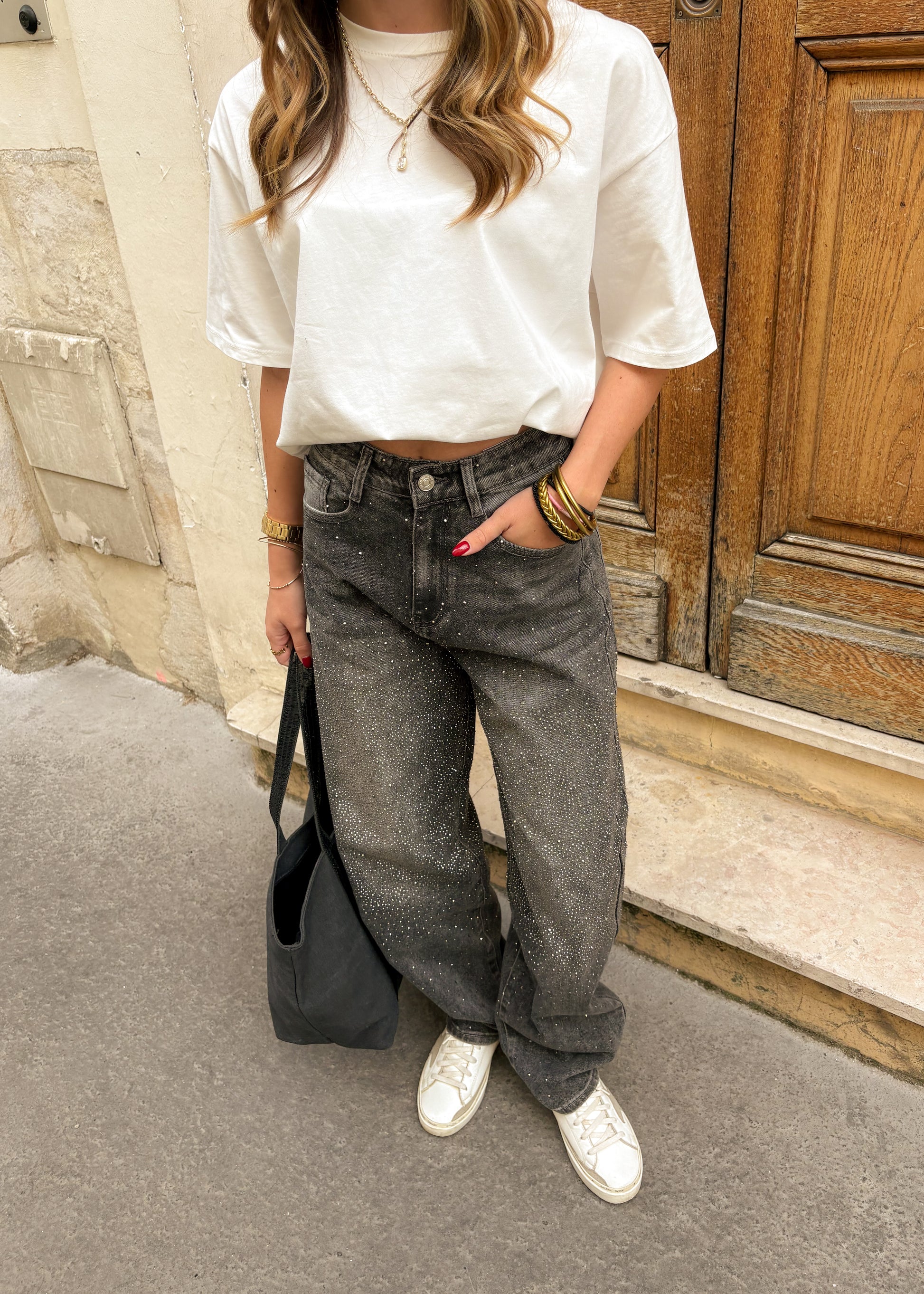 Découvrez le jean Naomi orné de strass. Sa coupe droite et légèrement loose offre une allure décontractée tout en restant ultra-stylée.