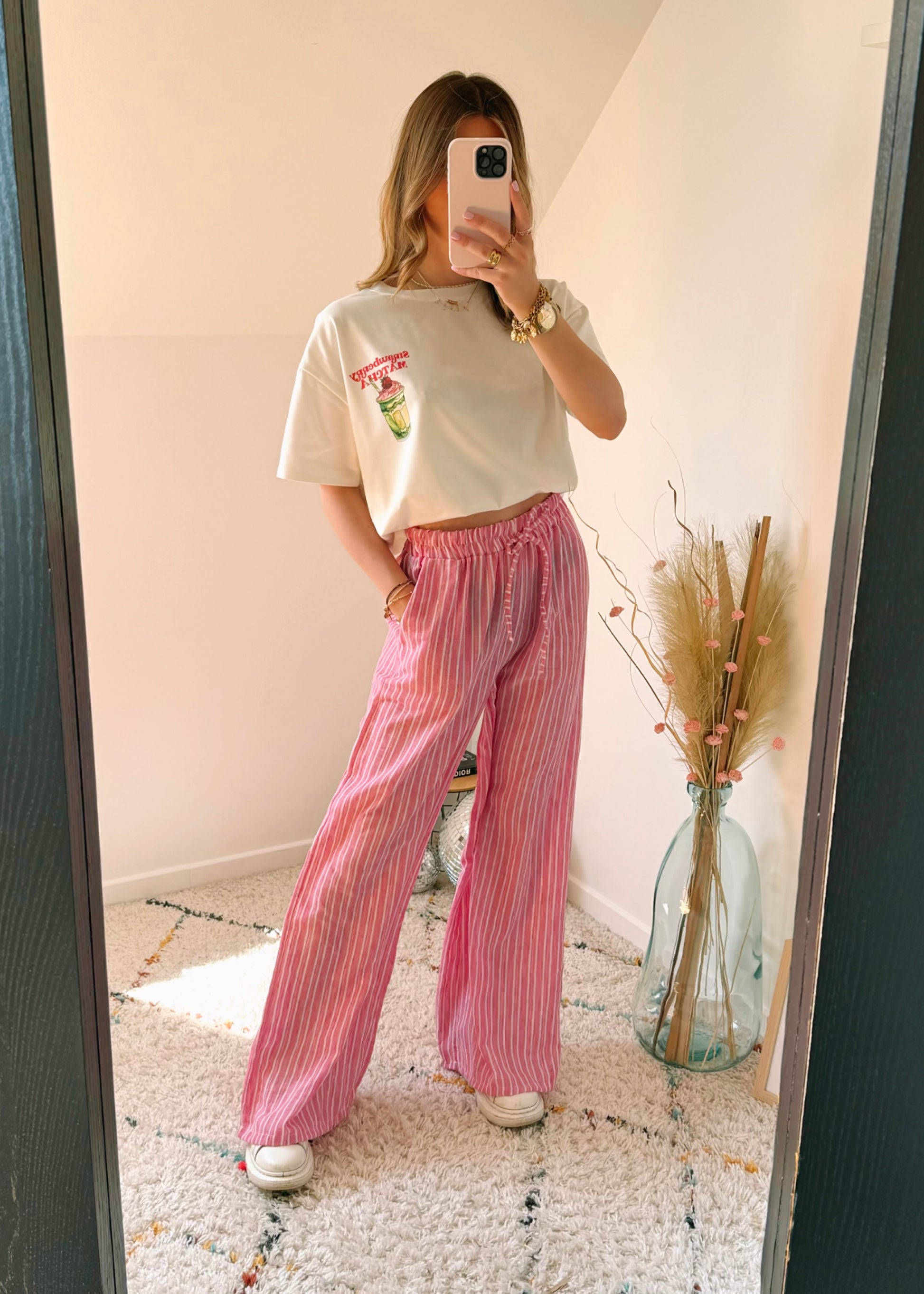 Ultra léger, fluide et coloré, ce pantalon rayé rose et blanc est la pièce parfaite pour un look comfy mais tendance. Sa taille élastique et sa coupe ample offrent une liberté totale de mouvement.