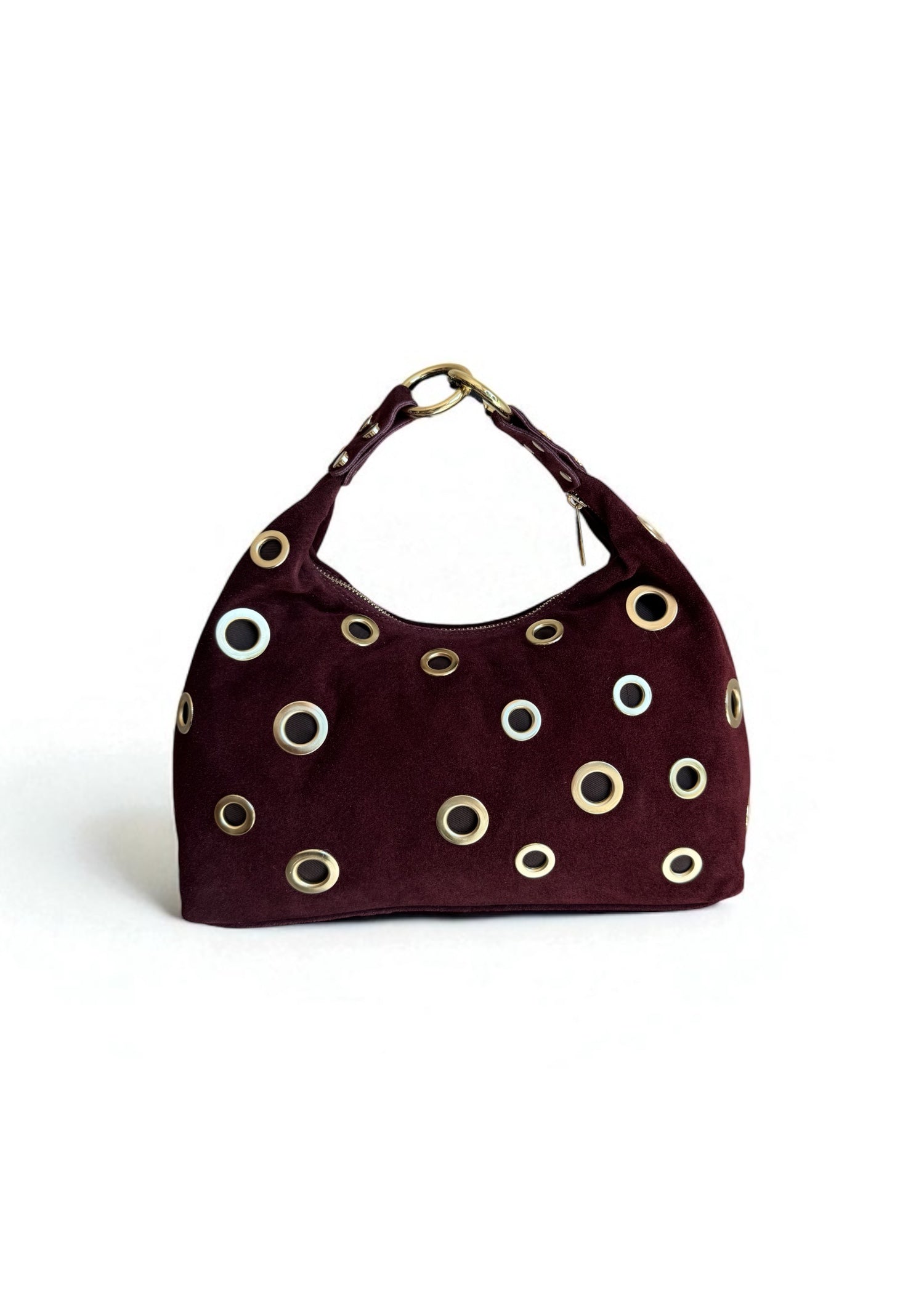 Découvrez le sac Rocker, confectionné dans un daim de couleur bordeaux, il est orné de grands œillets dorés qui lui confèrent un caractère unique et une touche de sophistication rock.