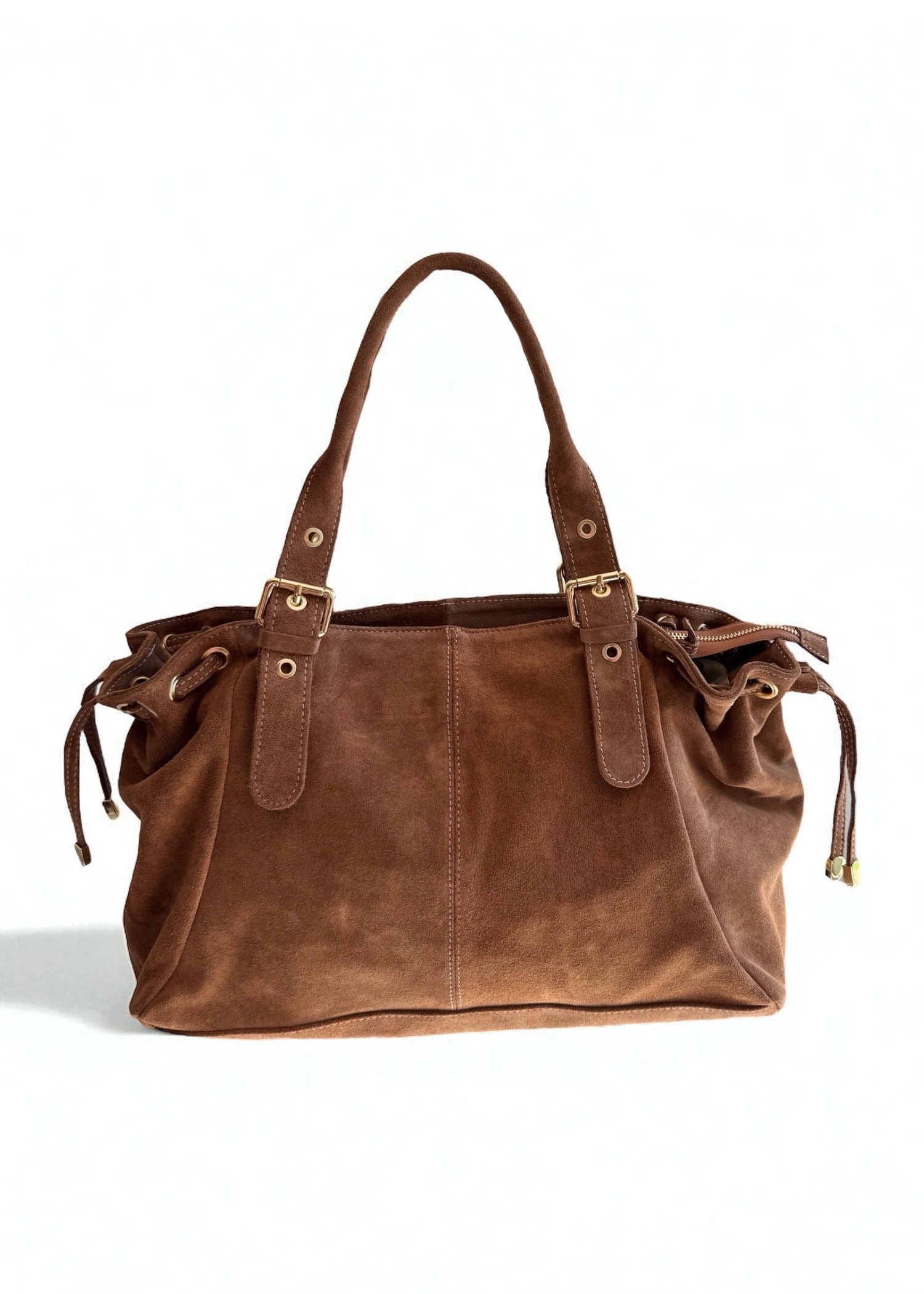 Ce sac en suédine séduit par sa texture veloutée et ses finitions soignées.