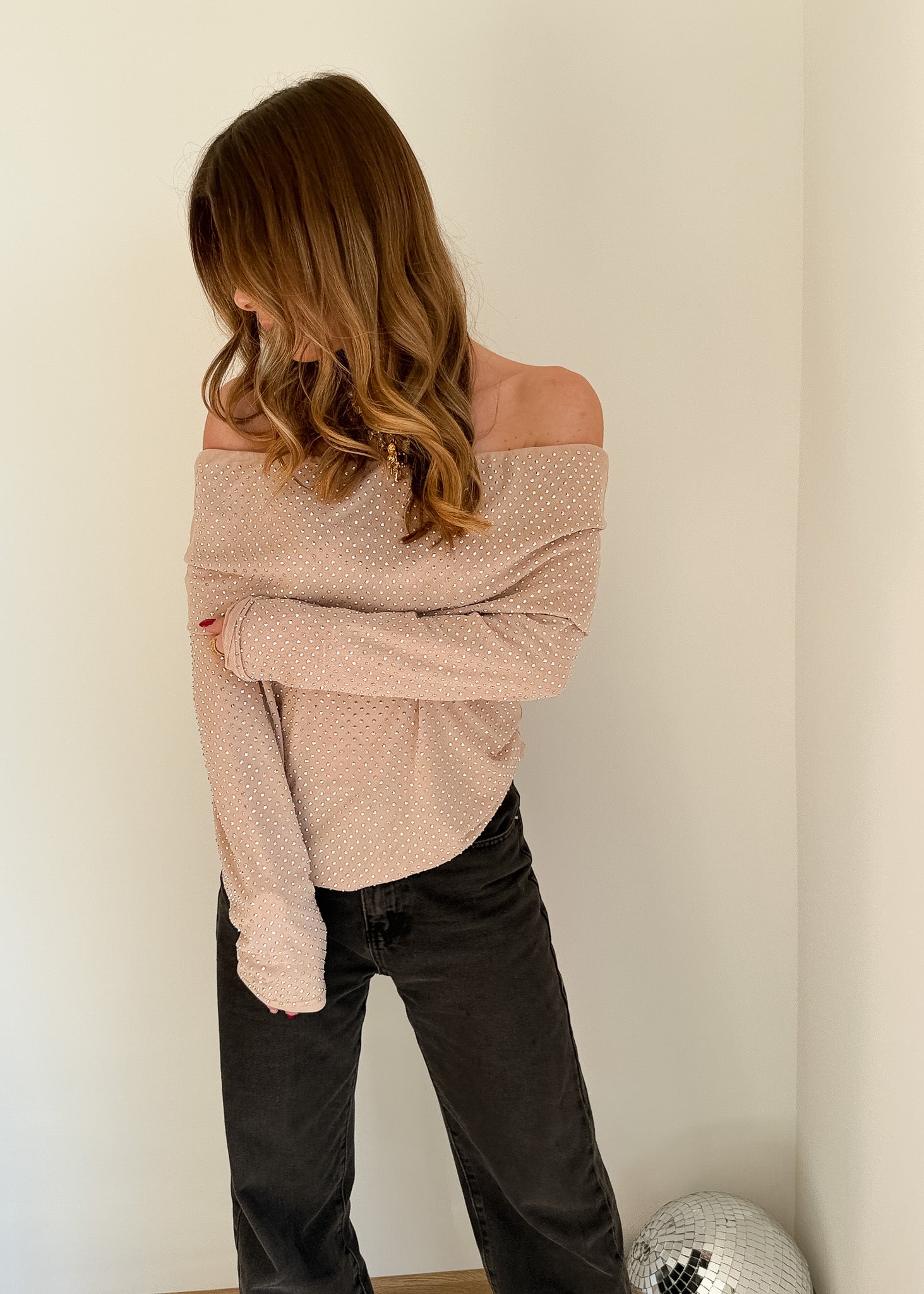 •Tissu nude/rosé recouvert de mini strass scintillants.